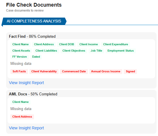 When the file check has been requested for a policy, the AI will be engaged. To check the AI Completeness score you need to go to Compliance > File Checks > View. Once you are inside the individual file check request created for the new policy, you will be able to see stage one (if finished) Completeness. This stage will show you how complete the submitted documents are. The AI will look for certain defaulted datapoints and retrieve feedback in a green/red basis meaning green it is in the document and red it couldn’t be found in the document.