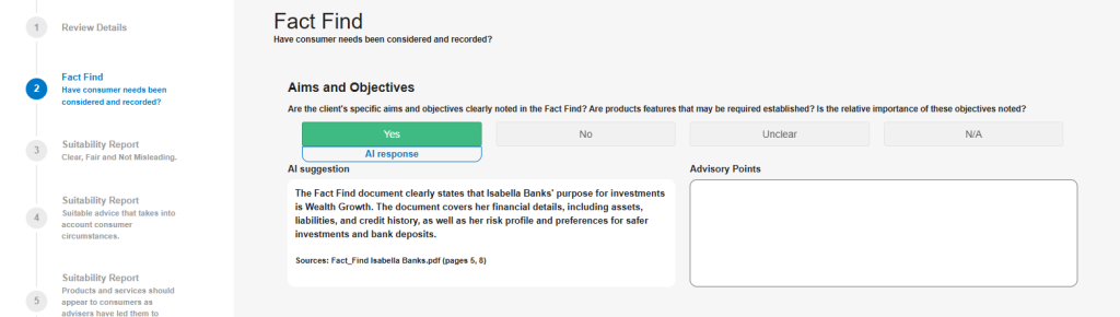 Once document analysis is complete, the AI moves to the File Check Review stage (2), acting as an independent reviewer. BAT provides a default file-checking form covering mandatory FCA compliance requirements; this form can be amended or replaced for a fully customised experience.