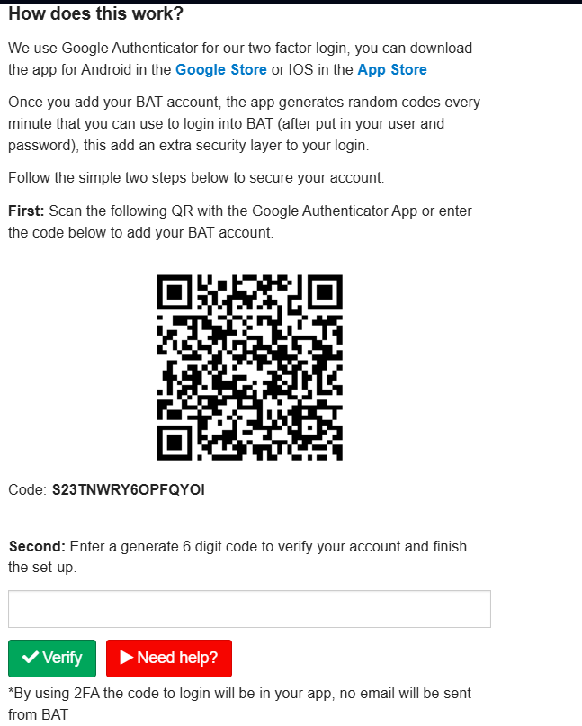 Linking your BAT account to 2FA is mandatory. Please follow these steps: